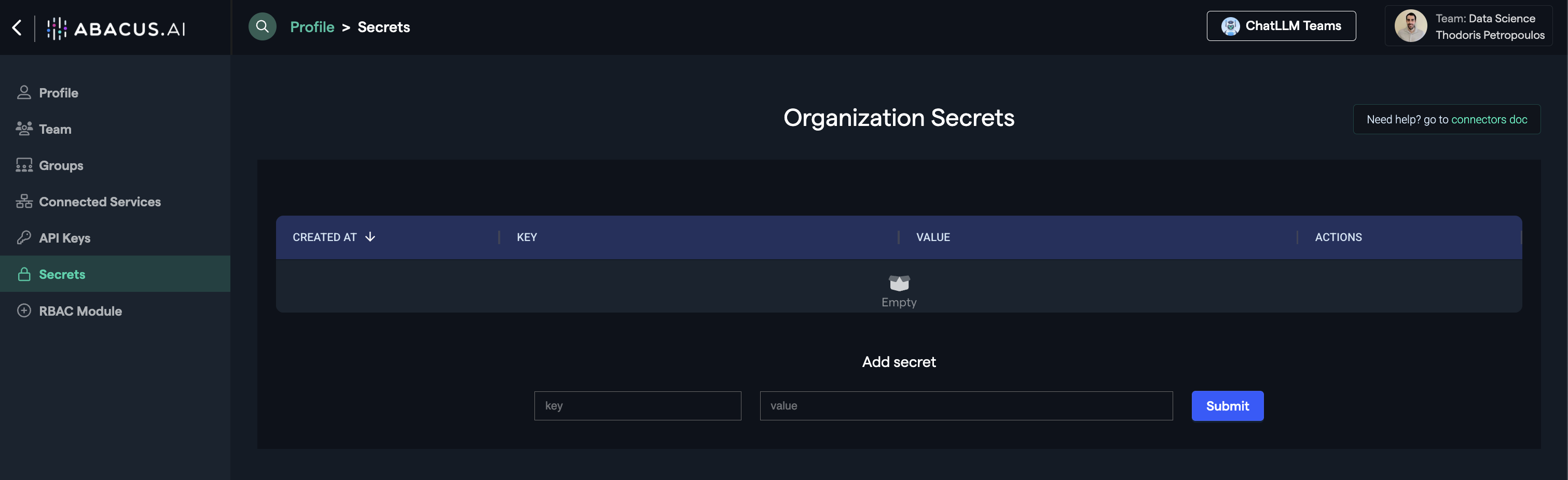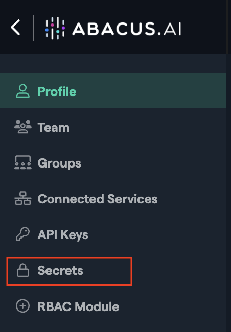 You can create a secret either by navigating to the Abacus.AI platform's secrets management section: