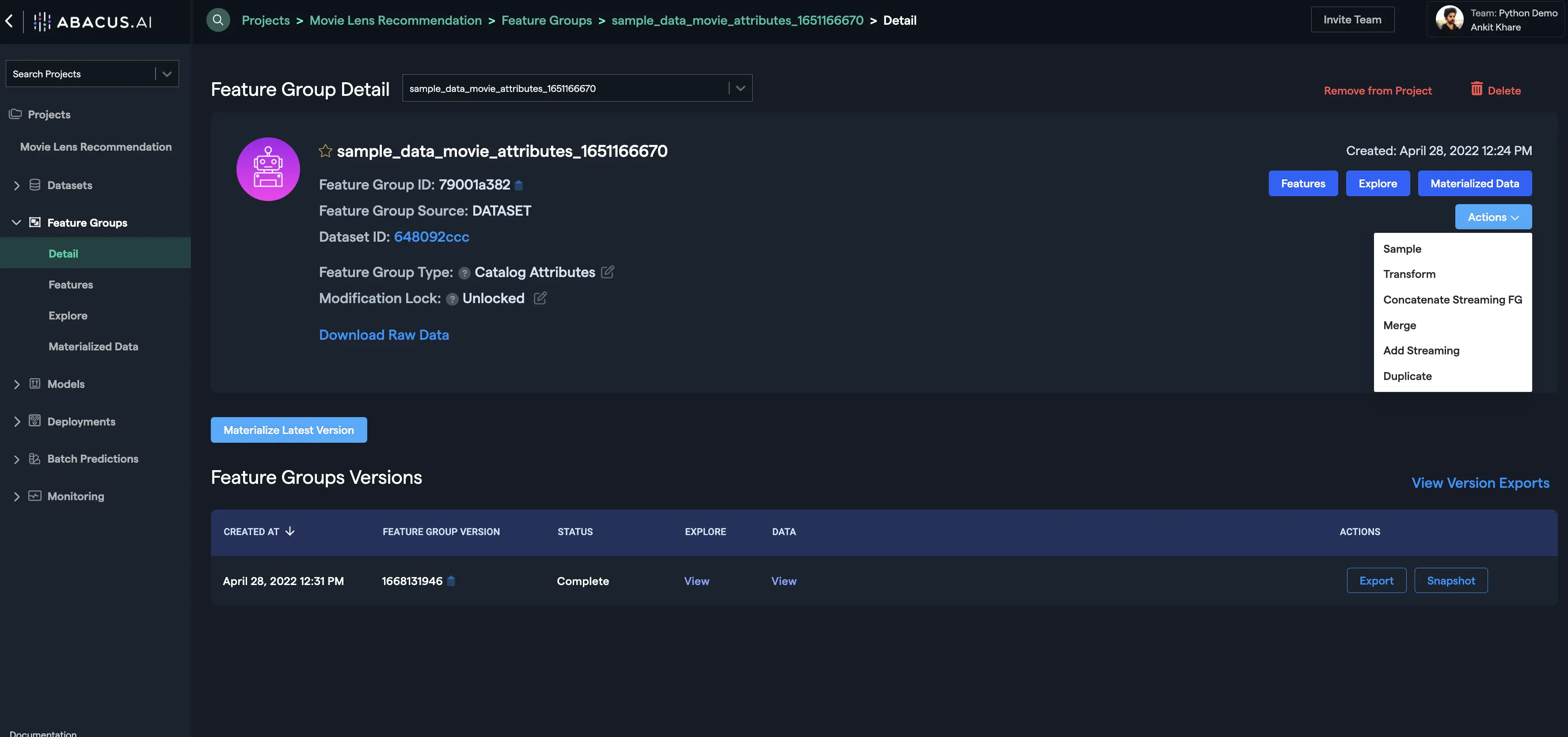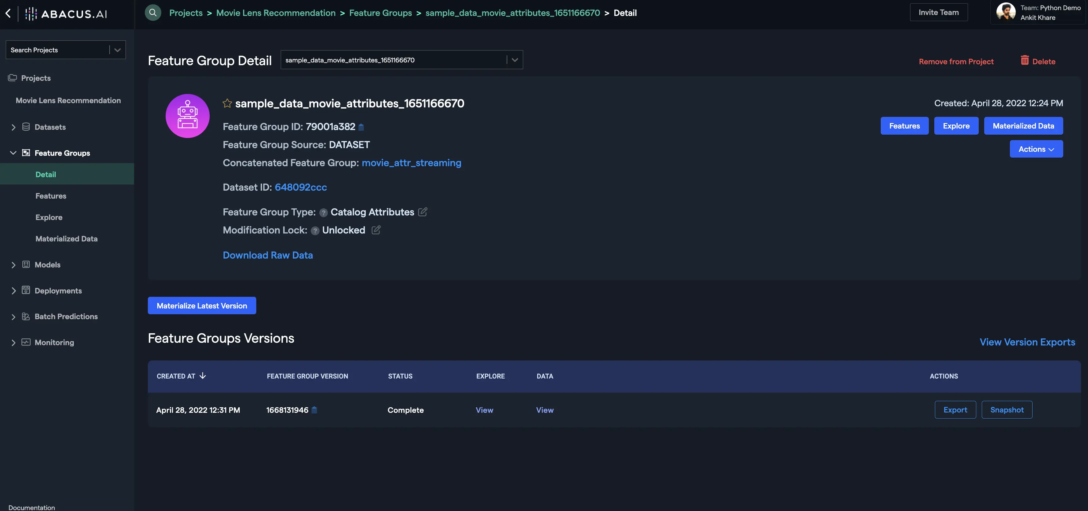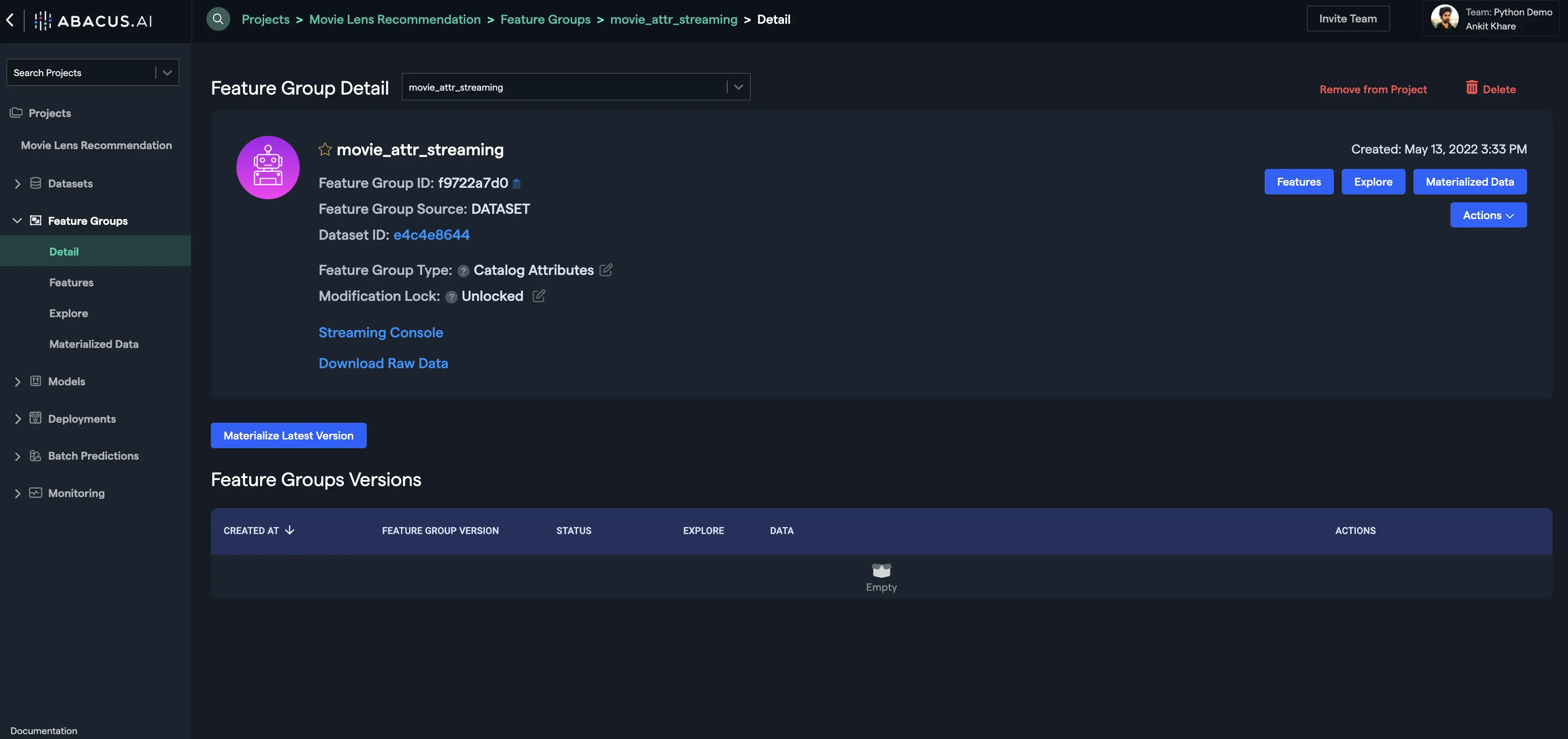 You can add streaming to an existing feature group type that is already attached to the project. Select the feature group from the Feature Groups list. The feature group details interface will be displayed: