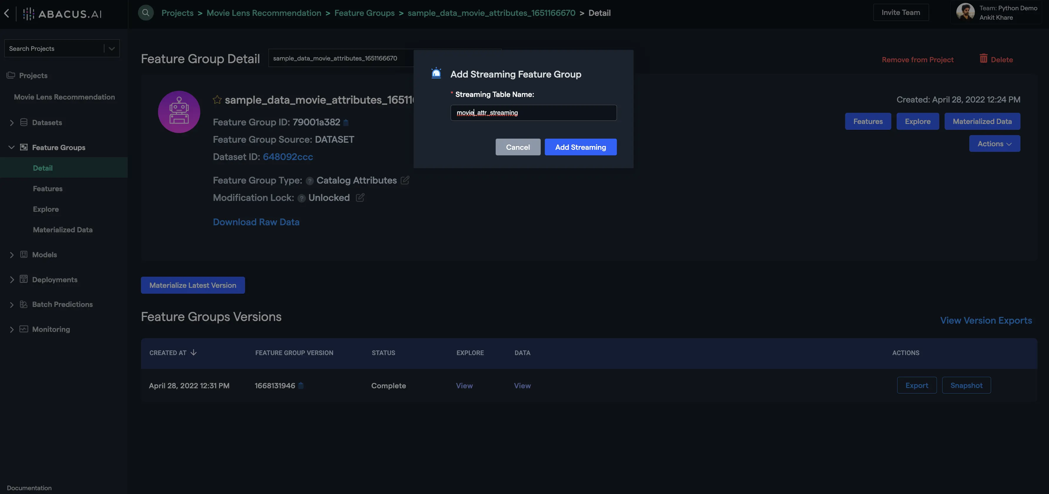 Click on the "Actions" button and select the "Add Streaming" option. Provide a table name for the streaming feature group to be created and click on the "Add Streaming" button. Your new streaming feature group will be created. The schema and the streaming configuration will be automatically populated to match the batch feature group. You can re-configure the streaming configuration if you would like.