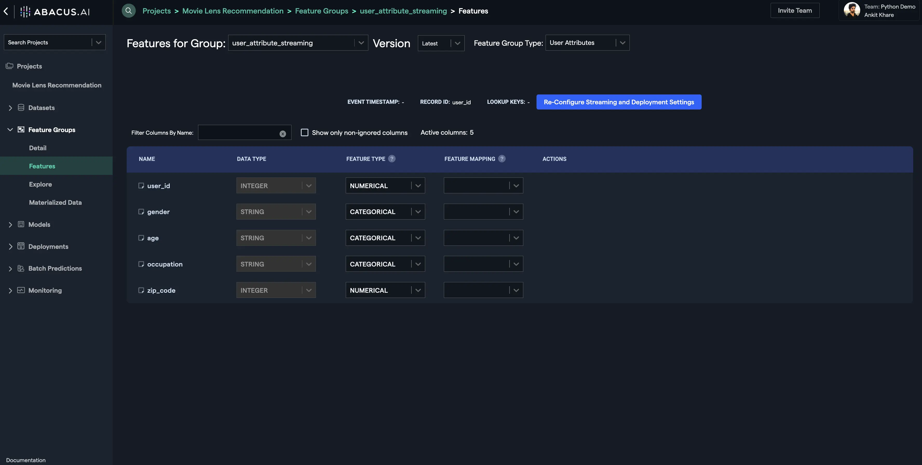 Verify the Feature Type and Feature Mapping for each feature. In the running example, the userID feature has been changed to feature type CATEGORICAL, and USER_ID feature mapping has been added: