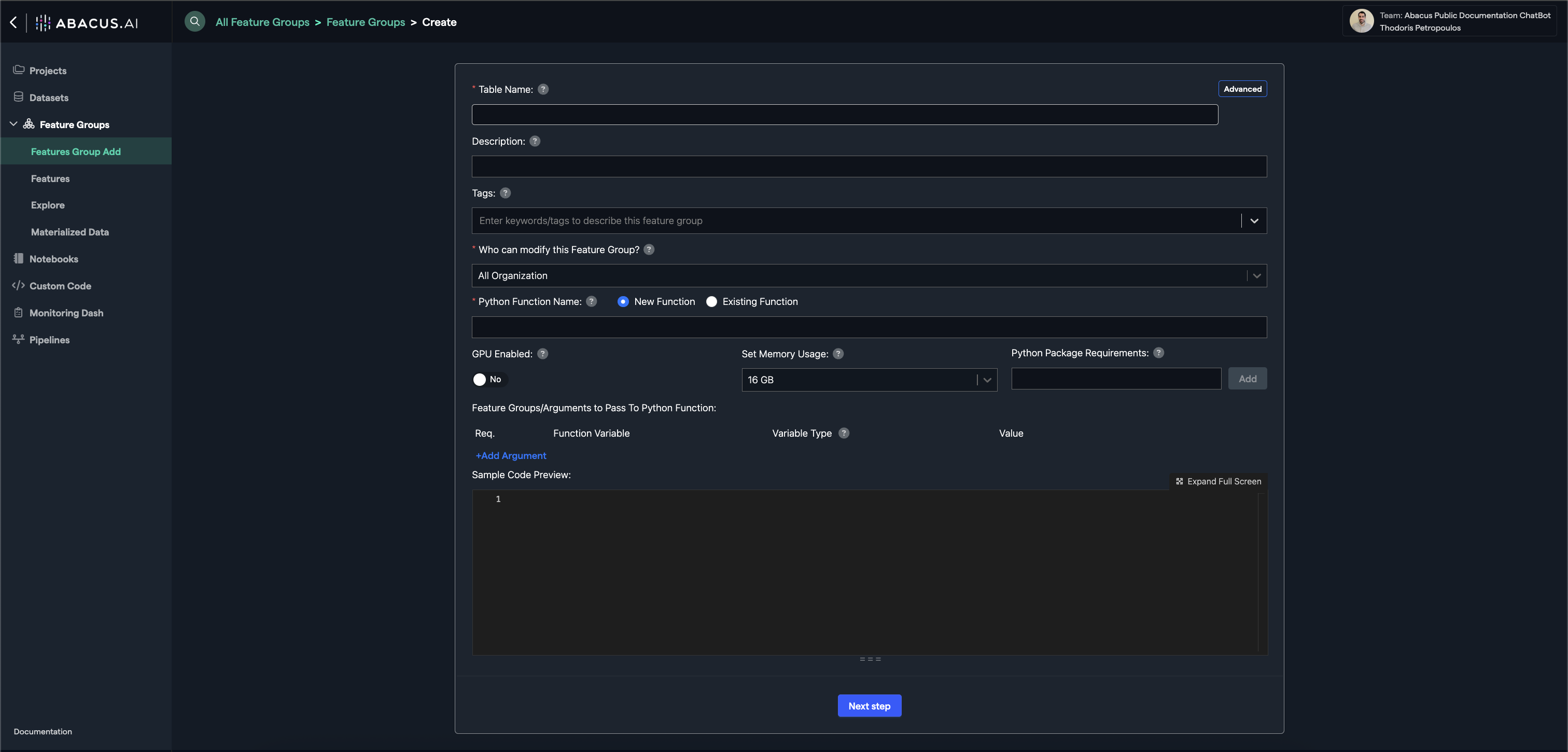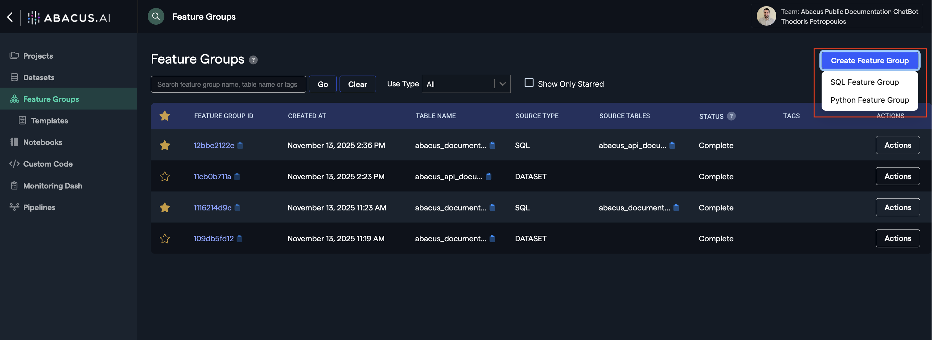 Python feature groups allow you to define custom data transformations using Python code within the Abacus platform. Follow these steps to create and manage Python feature groups.