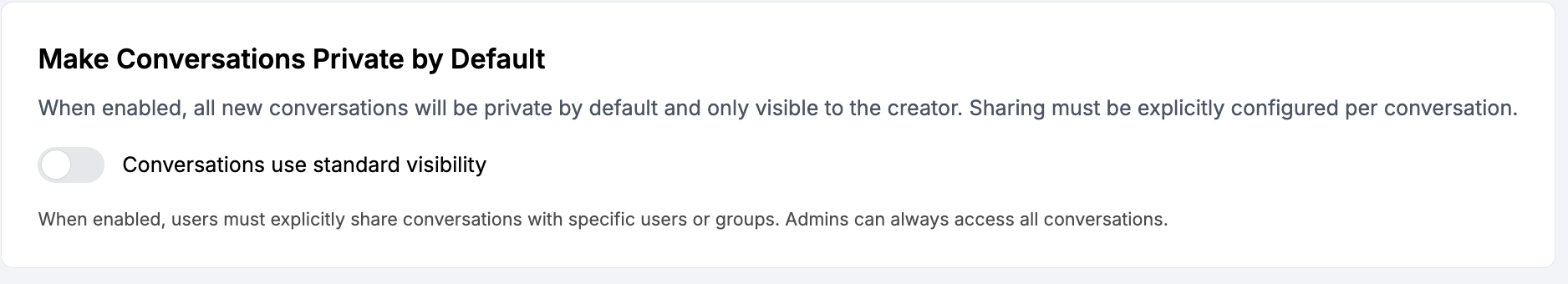 By default, anyone with a shared conversation URL can access it directly, as long as he is also a part of the same organization. This behavior can be configured using the option below: