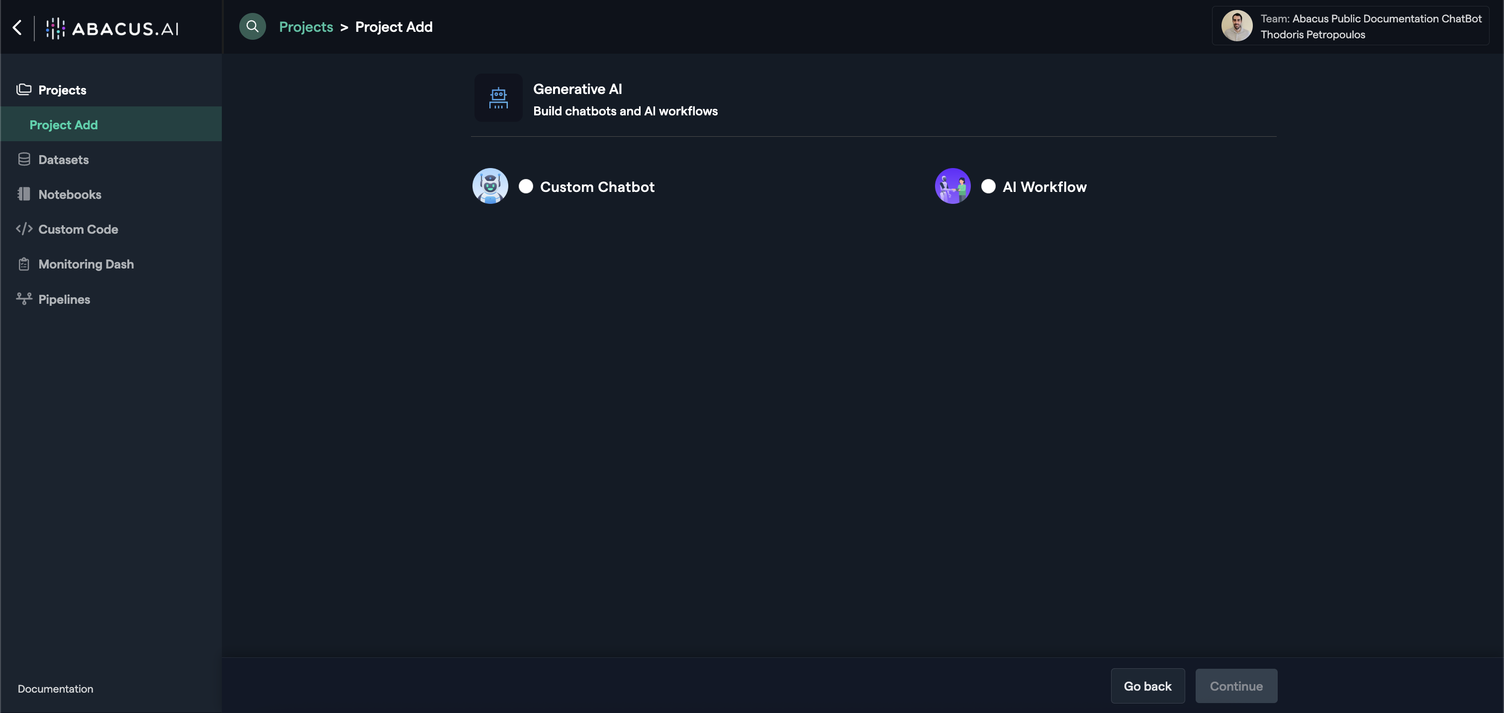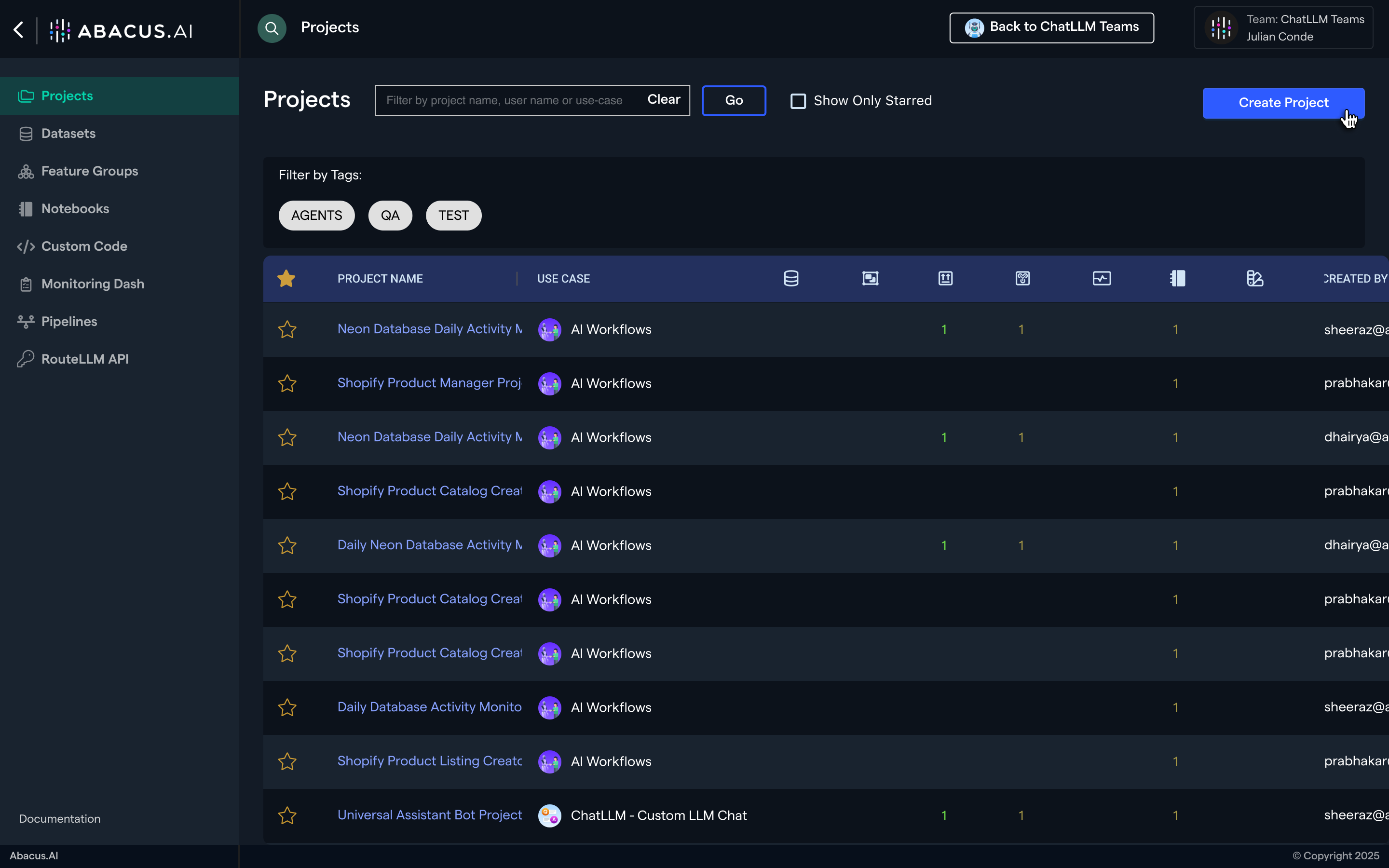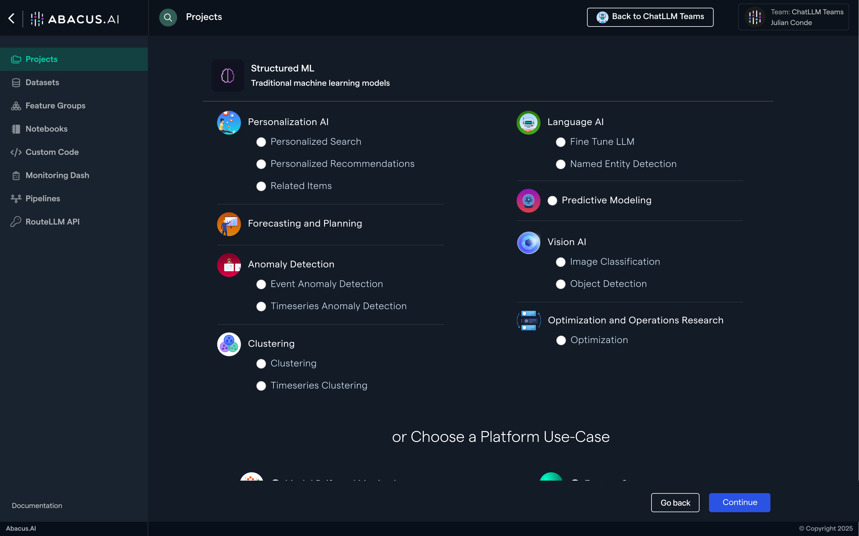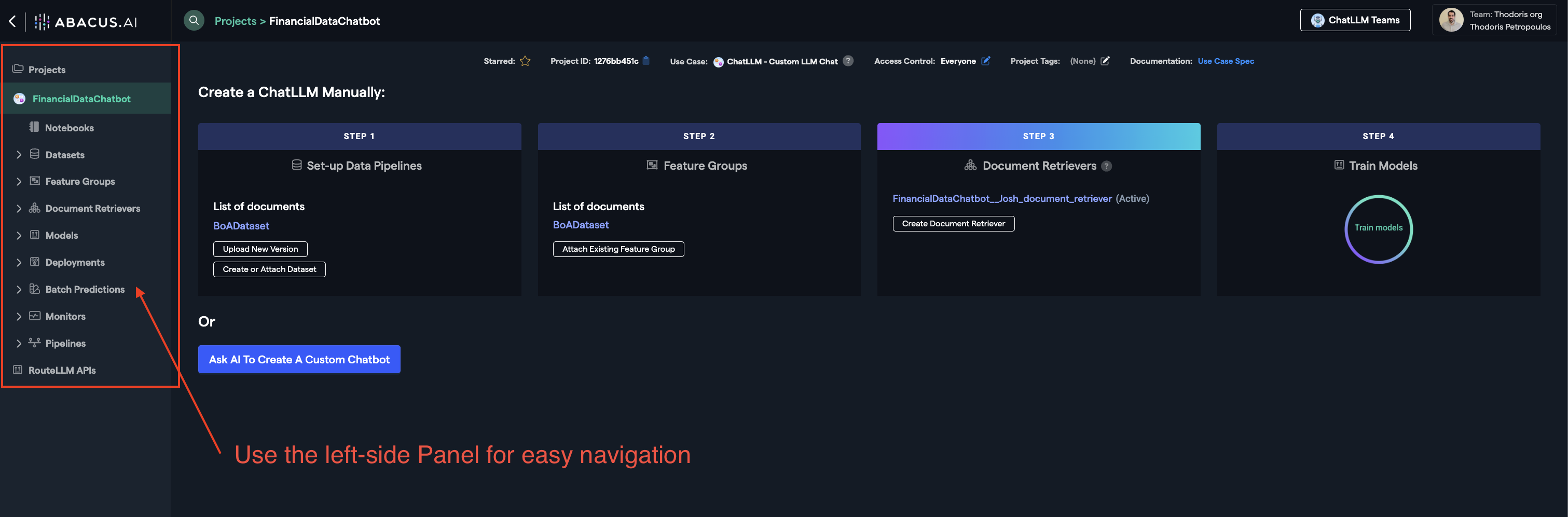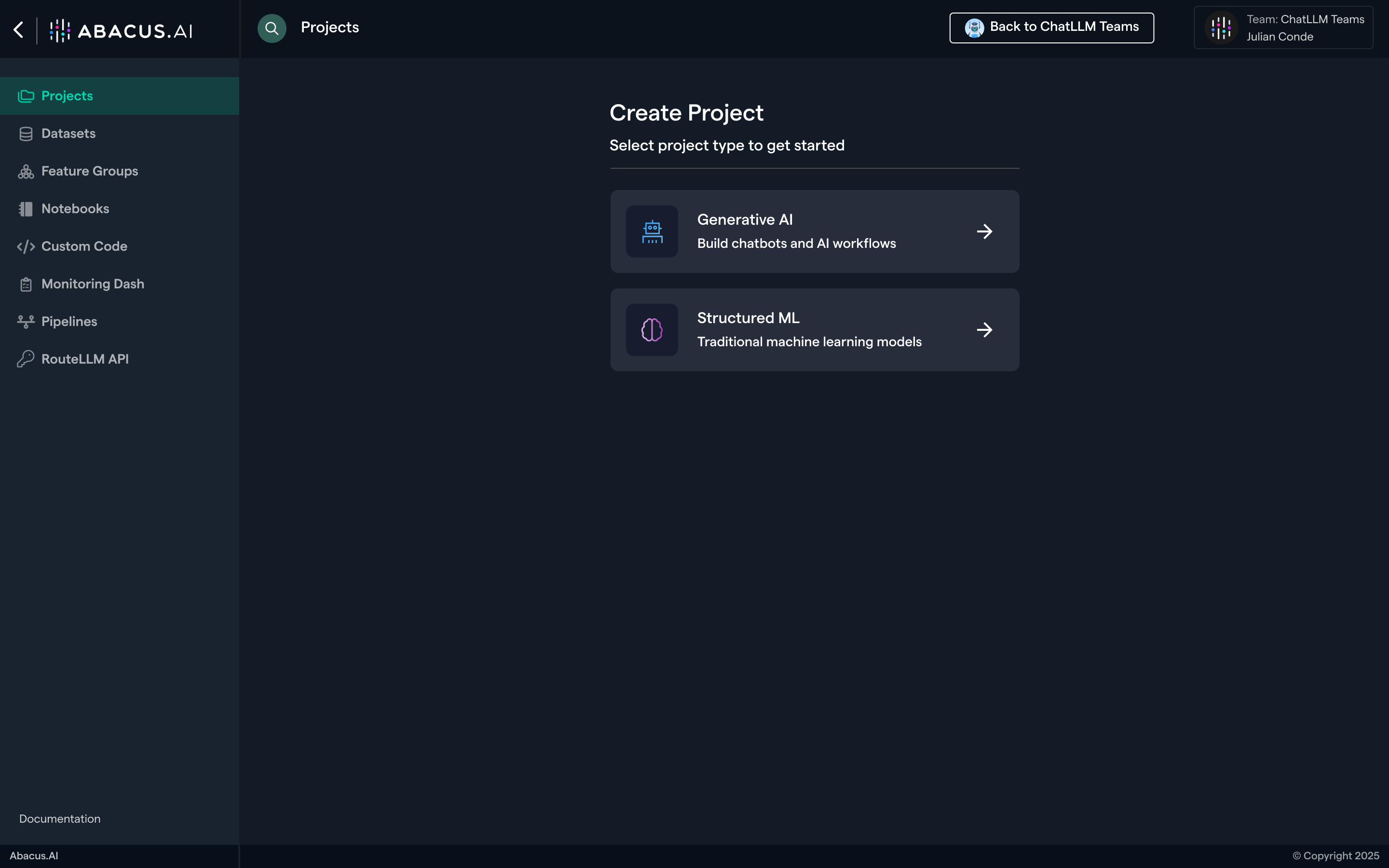 This guide will walk you through the basic navigation of the Abacus.AI developer platform and show you how to create a project (note: this is different from ChatLLM projects).