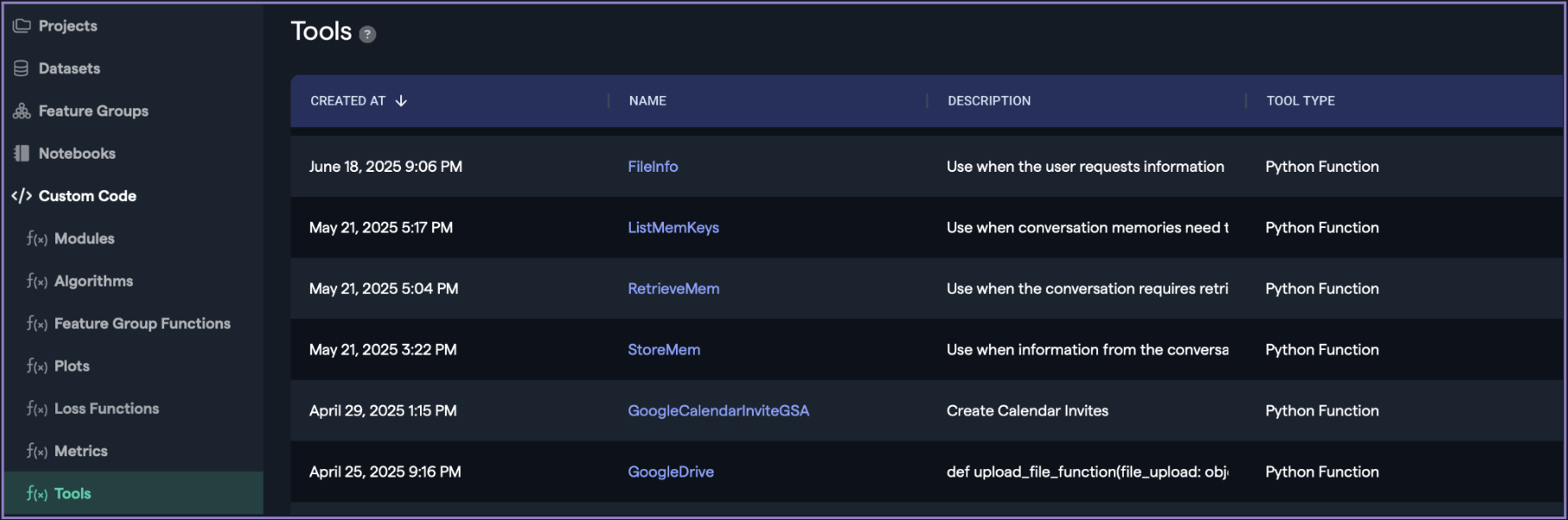 The Abacus.AI platform supports several types of tools:
