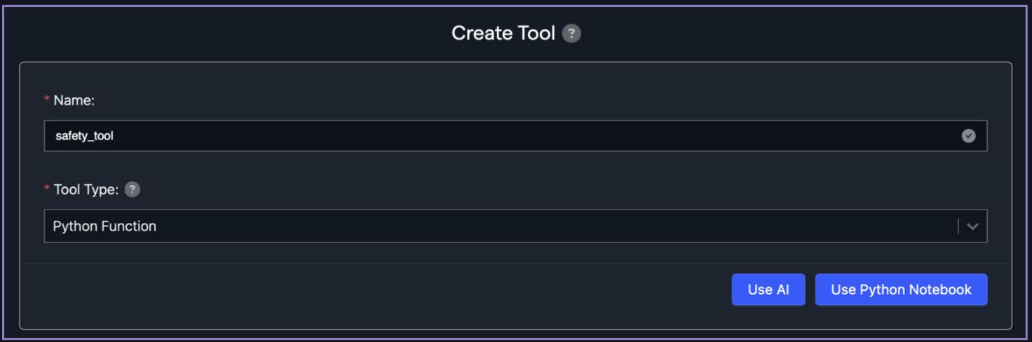 Make sure the tool type is Python Function and then build the tool either using the AI-assisted approach or directly with Python.