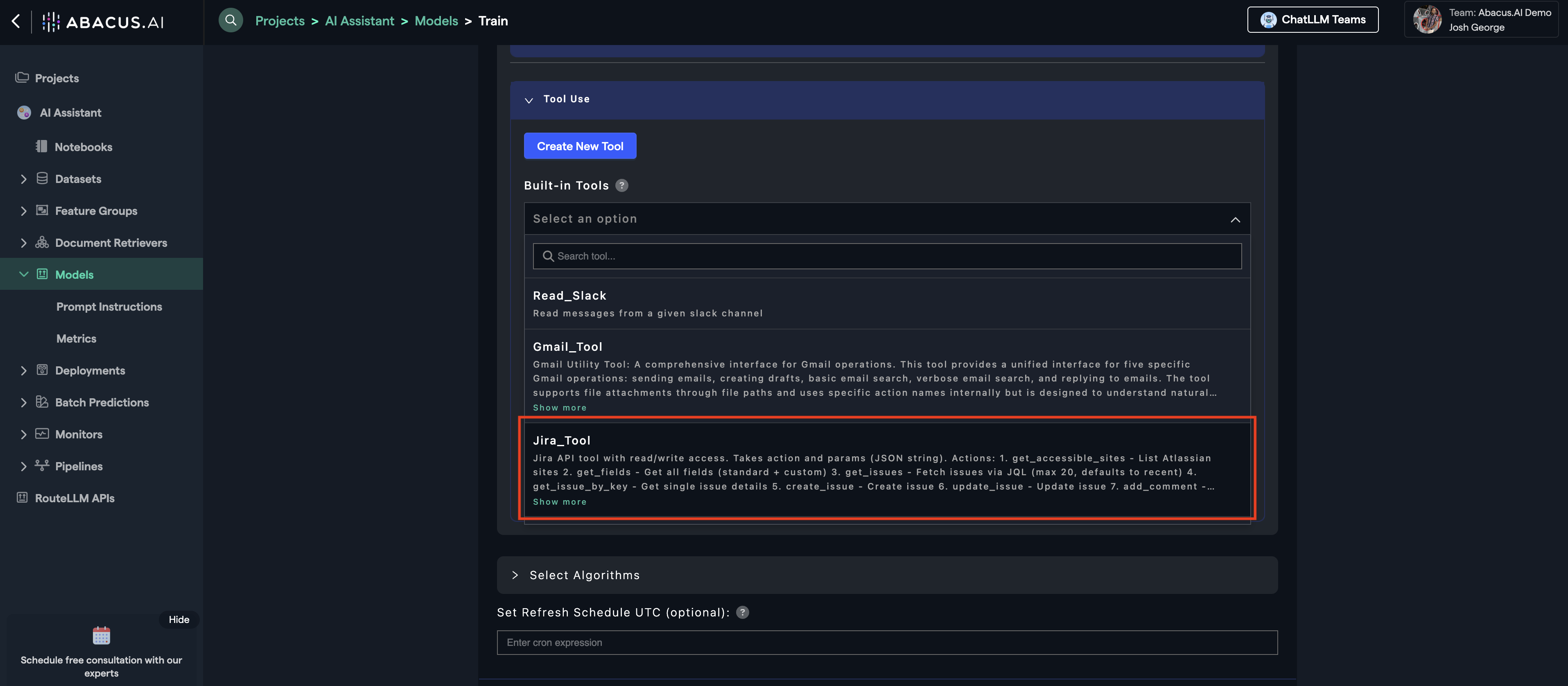 From Tool Use, navigate and click on Built-in Tools and select Jira Tool. This will allow you to access the tool's capabilities within the chatbot.