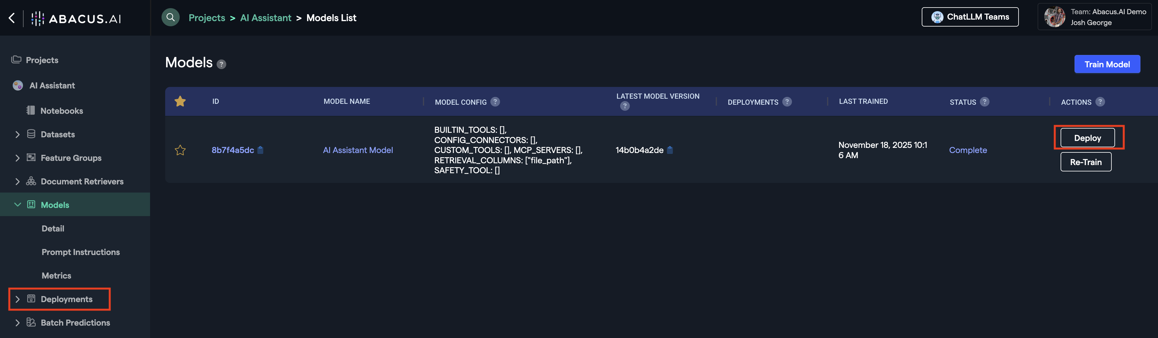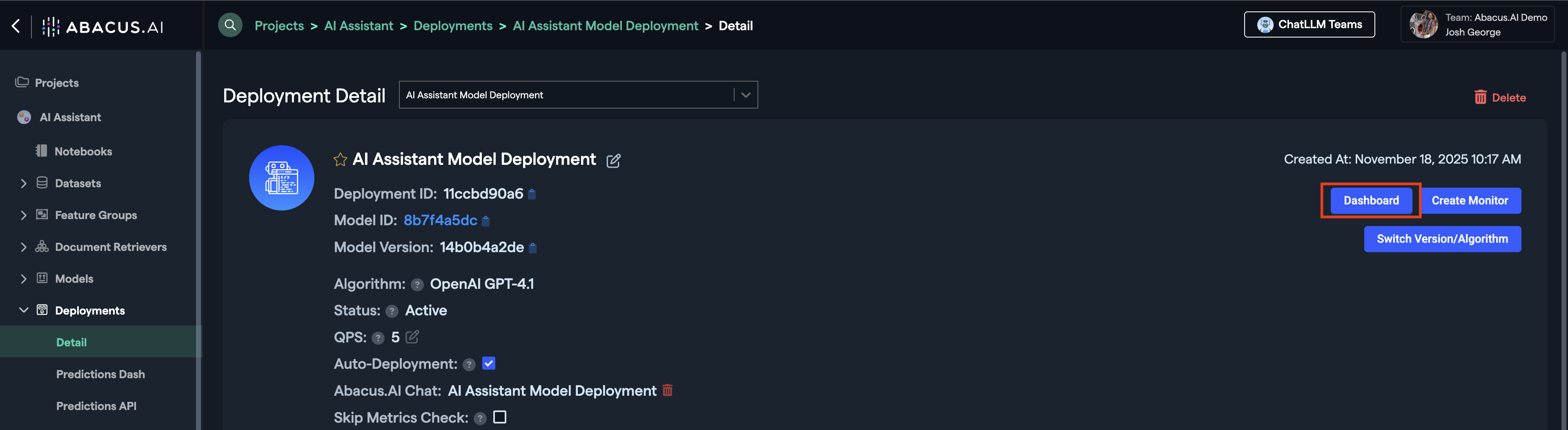 Follow the wizard to finalize deployment. Your deployed model will now become available in the Deployments page. By clicking on the Dashboard button, you will be able to create an external chat interface.