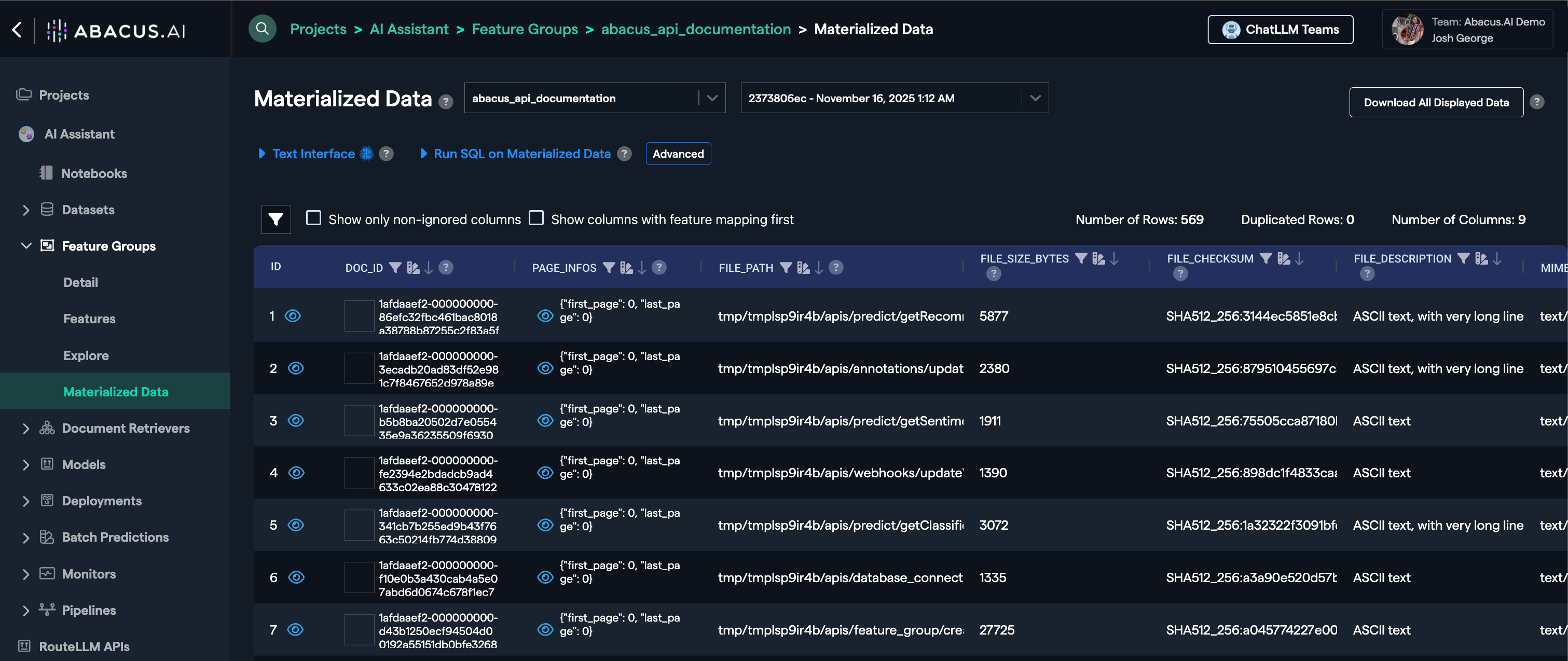 If you click on the Materialized Data view of the feature group, you will see your documents are listed in a tabularized format.