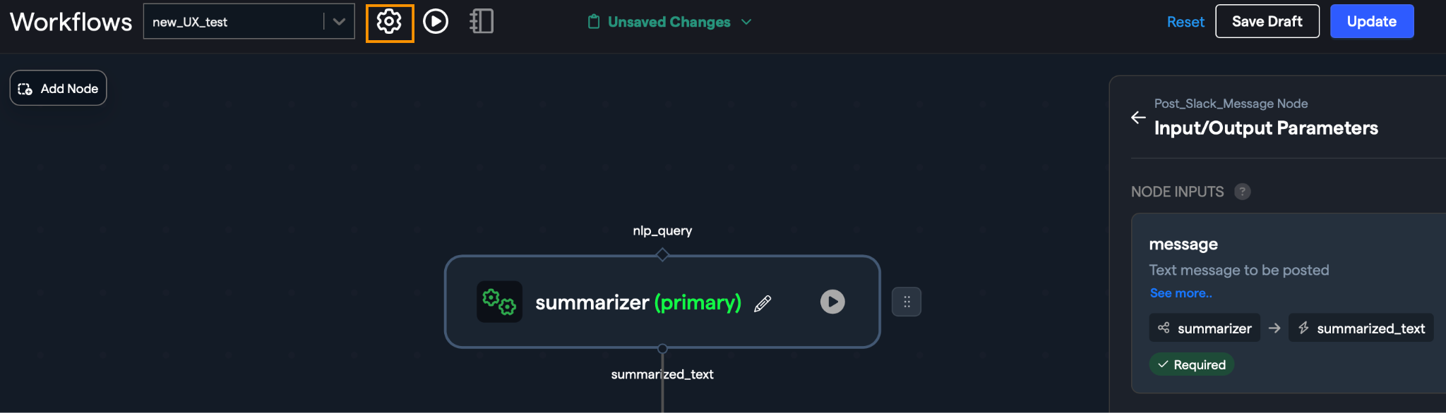 Testing individual nodes has been simplified by adding a Run button prominently on each node in the workflow diagram.