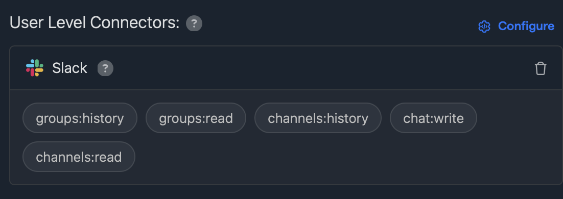 To update any of the specific connector scopes for these tools added to a workflow, click on the configure button. This will allow you to manage the specific access / capabilities for the connectors on a workflow by workflow basis.