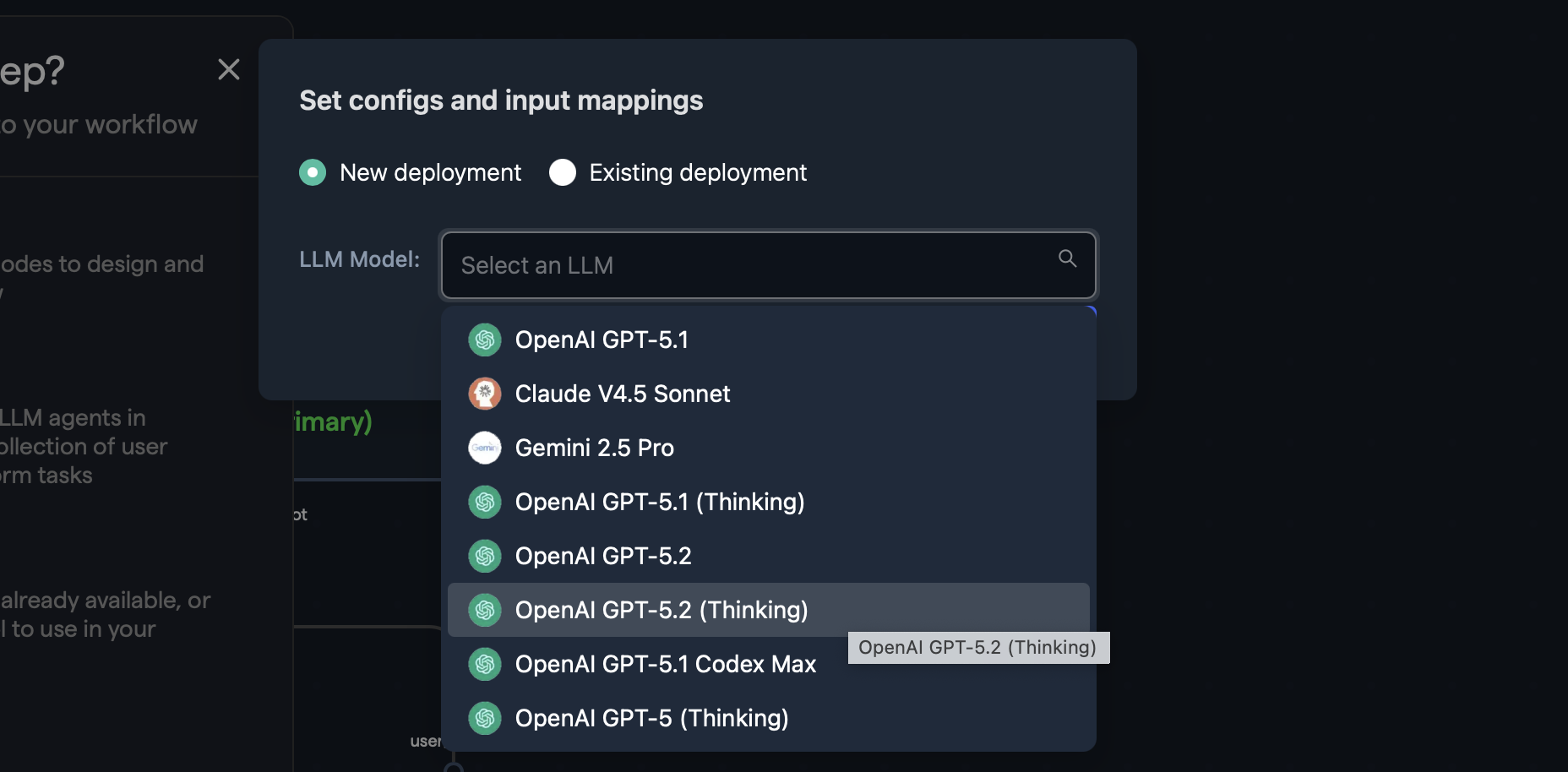 The system will give you two options for adding the node into the workflow: New or Existing. When adding a New Agent Node select the LLM from the dropdown list: