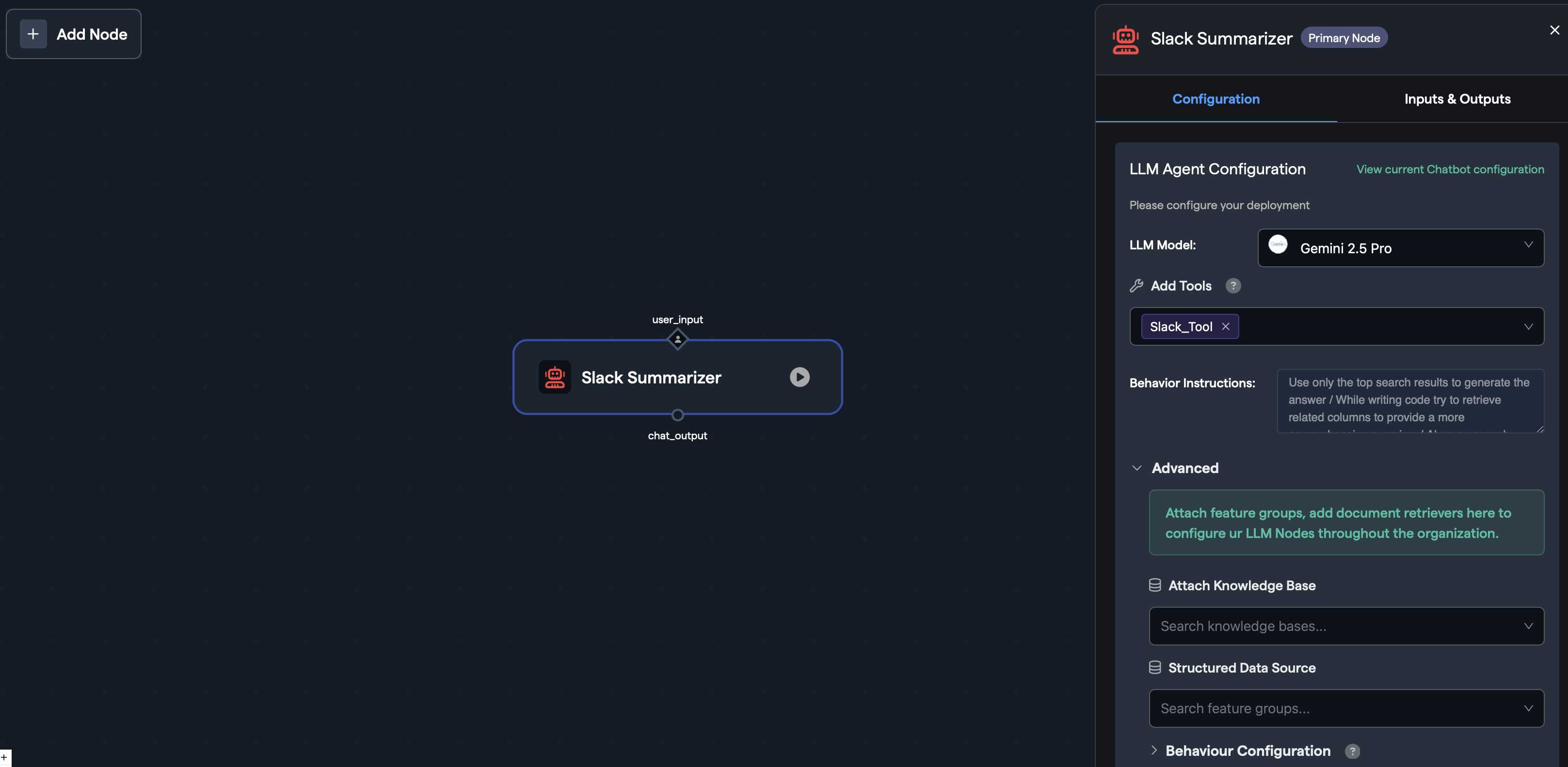 LLM Agent NodesA new feature of the workflows are the LLM Agent Nodes which incorporate the power of the Abacus platform to handle common agent tasks like tool integration and data processing without having to build them each time. In the workflow builder select Add Node and then LLM Agent Node from the options: