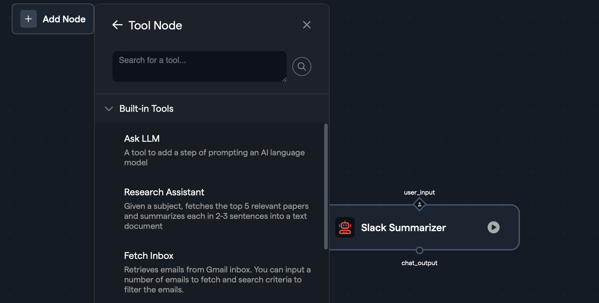 Tool NodeThe Tool Node has been improved to make finding relevant tools easier and more intuitive. The UI is split between Built-in Tools that have been build by Abacus and Created Tools that have been built by you or other members of your organization - you can also create new tools with the Create New Tool option.
