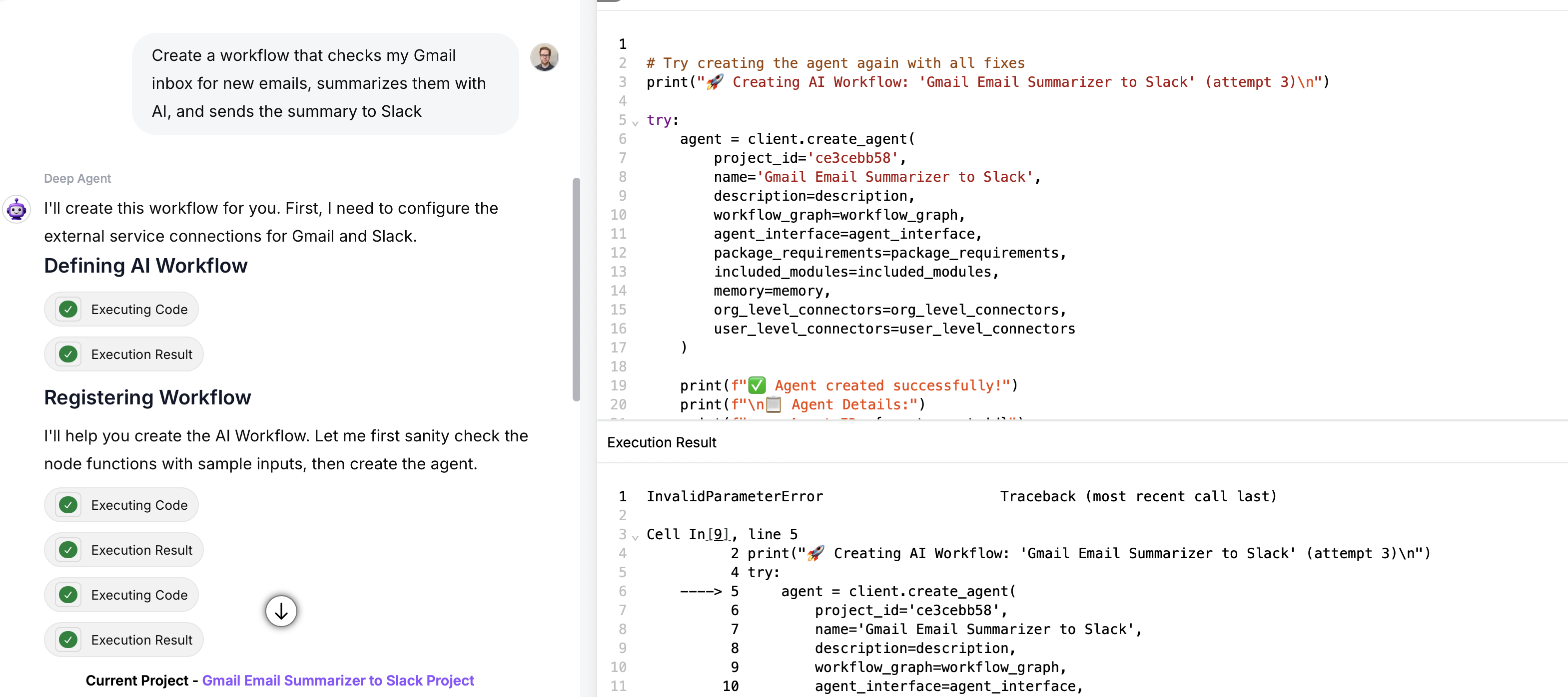 From the options above the prompt window choose AI Workflow. DeepAgent will prompt you to provide specific details of the workflow that you would like to build and will then plan how to architect that as a workflow. After planning it will build out the workflow node-by-node, writing the relevant code snippets and testing as it goes: