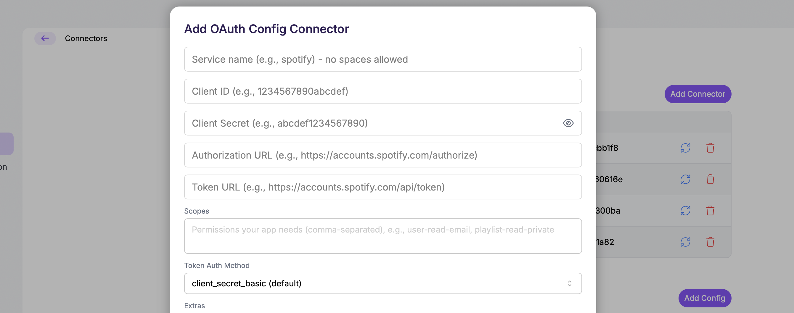 Clicking Add Config will open the configuration screen for authentication. Most services that support this type of connectivity will have OAuth or developer specific documentation that you will need to follow to generate the relevant IDs, urls and tokens.