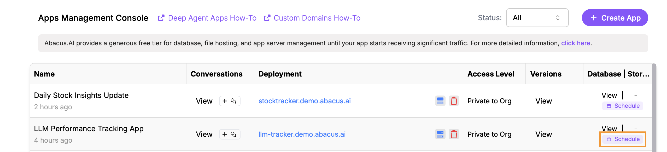 Database SchedulingA specific option has been added to the app management console to make scheduling database refreshes much easier. To access the App Management Console click on the Apps button in the top-left of the Super Assistant screen. Any apps that contain a database will give you the option the view or schedule