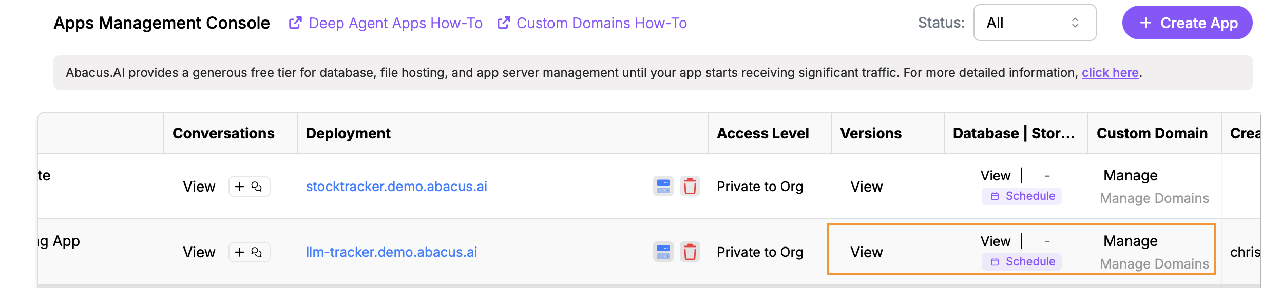 - Through the App Management Console by clicking to View Versions or Database, or by clicking Manage under Custom Domain.