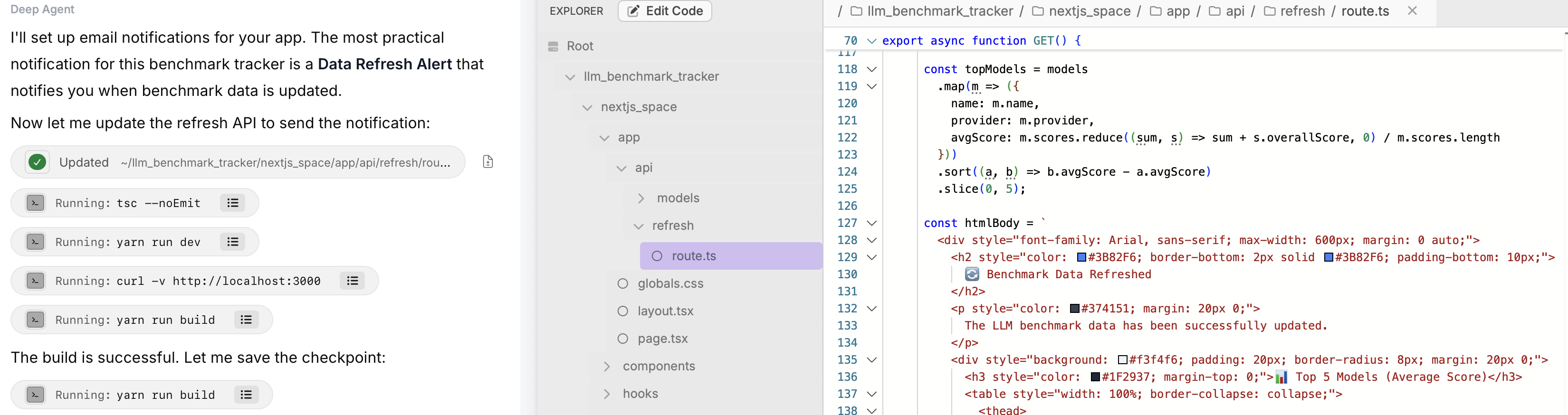 In this example DeepAgent creates a simple email notification that tracks when the underlying LLM benchmark data changes with a summary of the new top models: